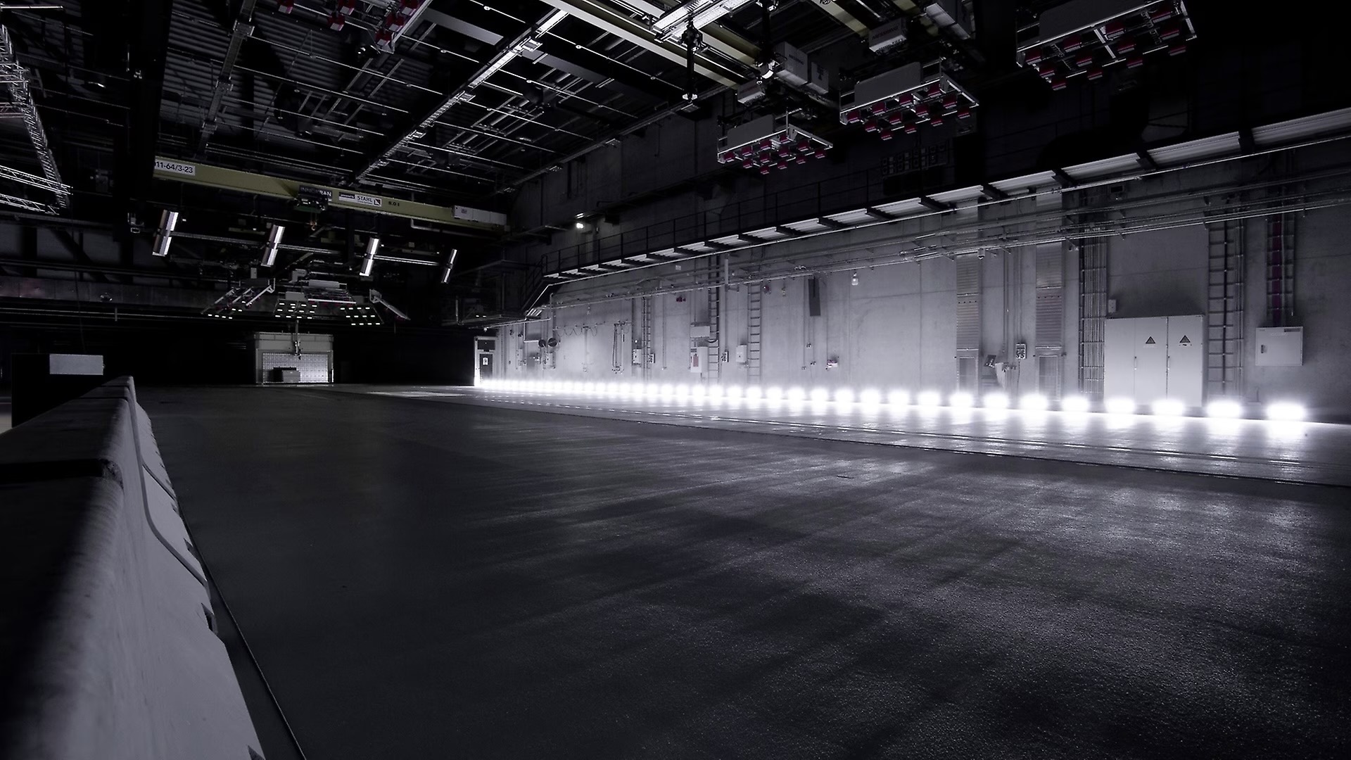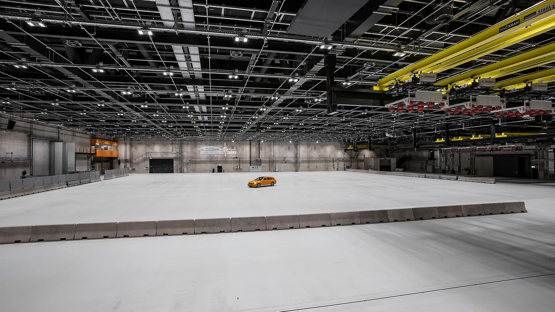 Level crash track surfaces (maximum tolerance 5 mm per 100 m) are important for crash tests with mobile barriers, where lateral impacts are simulated, for example. Apart from their pneumatic tyres, these barriers have no suspension system and might begin to oscillate on a less than completely level surface, falsifying the crash test result. To ensure a completely level surface, the floor slab rests on approx. 500 concrete pillars driven 18 m into the ground.