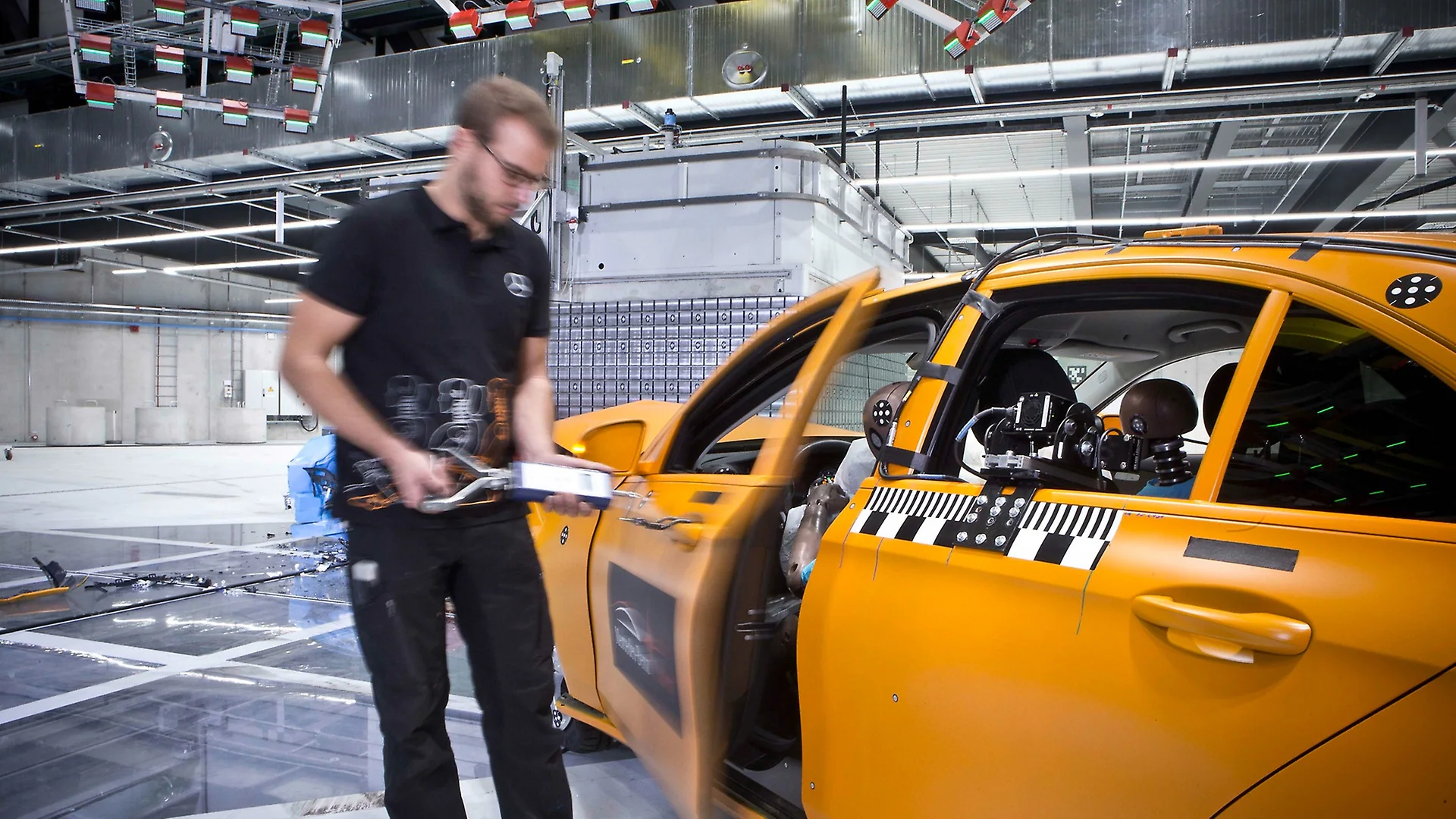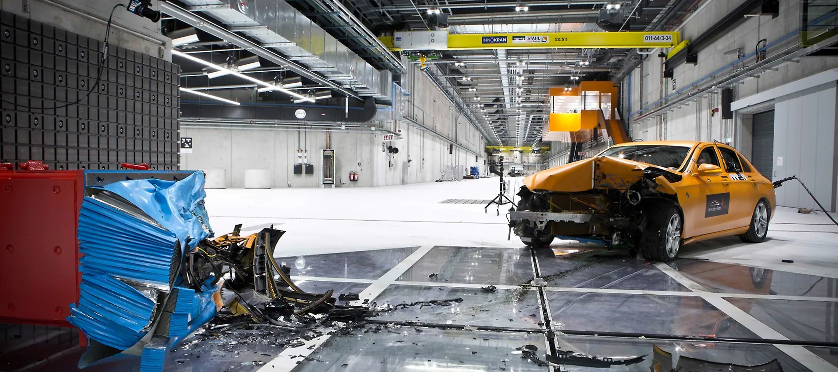 They house modern high-speed cameras which film the impact from below. Thanks to the compact Microtrack system, the guide rails for the vehicles are much narrower than before (70 mm rather than 180 mm in the old system). This means that unlike before, almost the entire underbody of the vehicle can be filmed.
